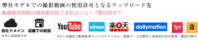 モデル肖像権保護の立場から弊社と直接取引のある企業(ショップ)が運営するサーバー、EC店舗ページ及び動画チャンネル等を使用先として商品動画オーダー時にお伝え下さい。
